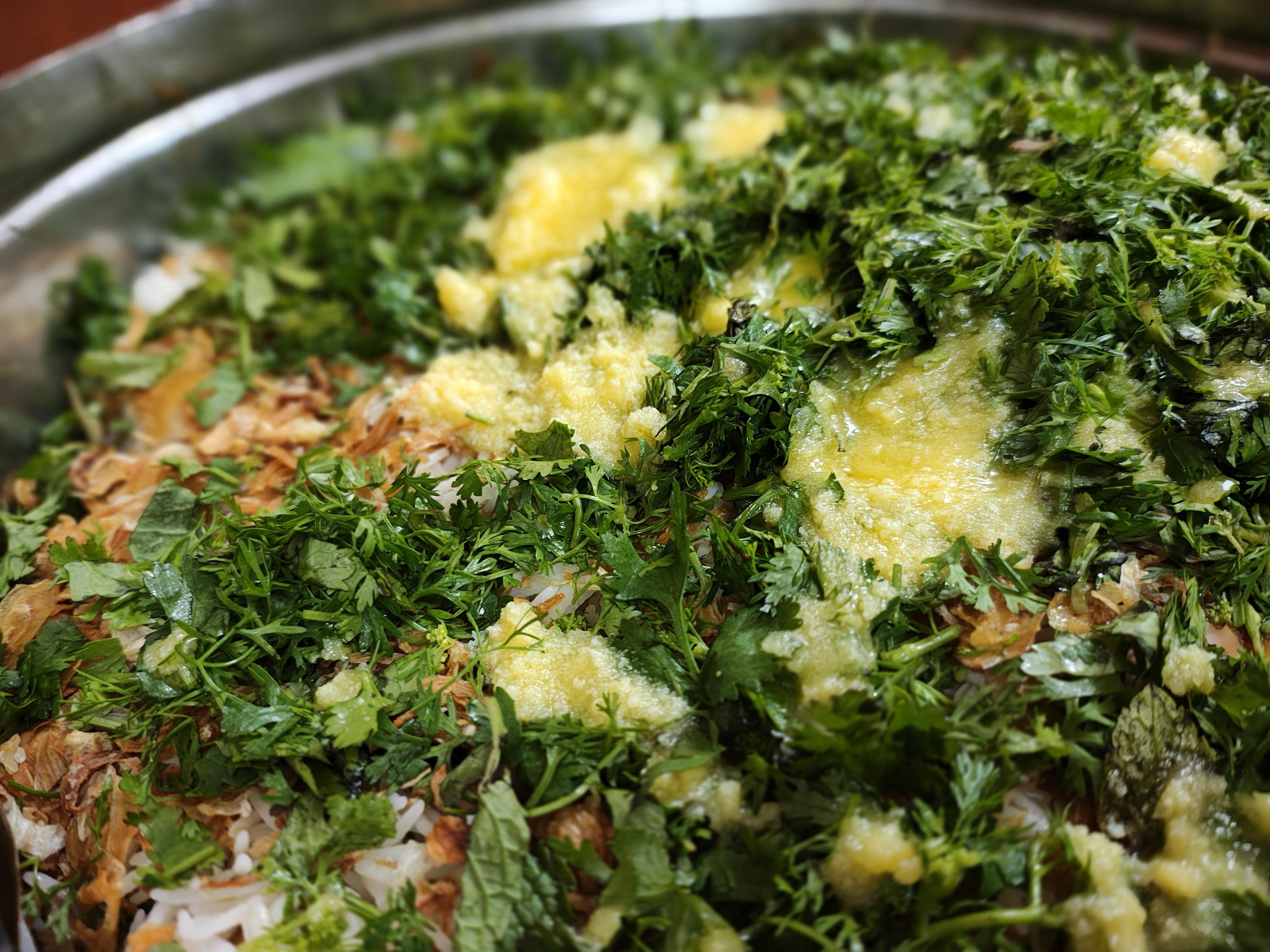 - In another vessel, add base layer of above gravy and then a layer of rice. On the rice, add butter, birista, kothmbir, pudina, kaju and manuka. Keep adding layers of gravy of rice till all gravy and rice are done